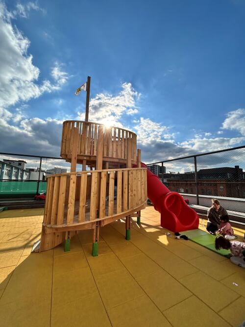 Unsere einzigartige Kita auf dem Dach des Aufbau Hauses kombiniert inspirierende Architektur mit viel Licht, Raum und einem sicherem Außenbereich. - Verlässliche Betreuung